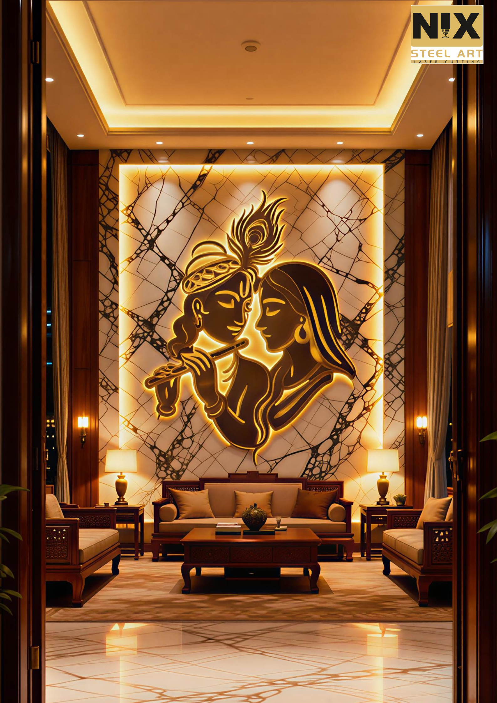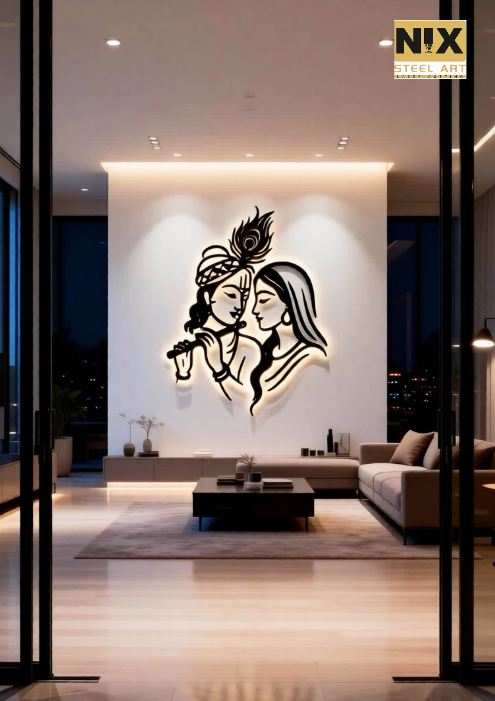 Bring divine love and timeless elegance into your space with the Backlit Radha Krishna CNC Metal Wall Art. This exquisite design captures the eternal bond of Radha and Krishna in a graceful silhouette, highlighted with a warm LED backlight that creates a serene and luxurious atmosphere. The glowing outline enhances the artistic depth, making it a stunning spiritual centerpiece for any interior.