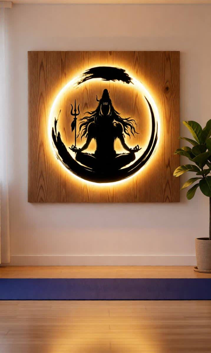 The precision laser-cut metal silhouette is beautifully enhanced with a warm LED backlight that forms a glowing halo around the artwork. Mounted on a premium wooden back panel, the contrast of matte black metal and natural wood texture adds a modern yet divine touch to your interiors.